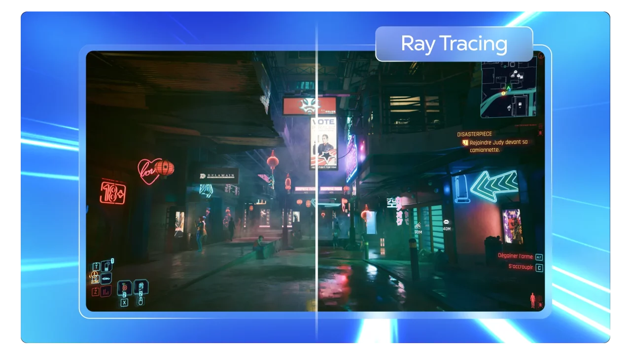 With Ray Tracing, for example, you can observe shadows that form according to the position and intensity of light sources in the game. Reflections on smooth surfaces are also more realistic, reproducing objects and surrounding elements. RTX also improves transparency effects, light refraction, and diffusion. For instance, shop windows or water surfaces can be rendered more realistically, reflecting and distorting the surrounding elements.